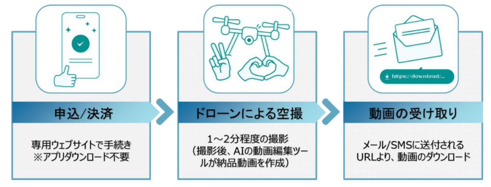 ドローンが撮影した映像はAIによって自動で編集され、高画質でインパクトのある映像がお客様のお手元に届きます。