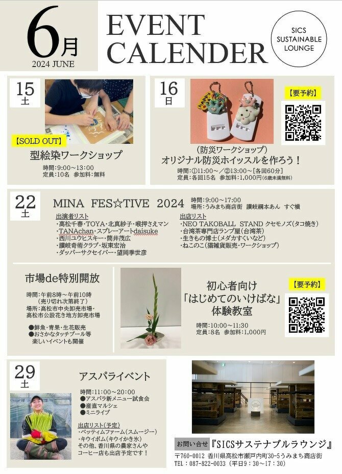 2024.06.06 ☆イベントカレンダー【6月】☆SICSサステナブルラウンジ ▲6月のSICSサステナブルラウンジイベントカレンダー▲ 詳しくはコチラをご確認ください! ■お問合せ先 JTB 高松支店 TEL:087-822-0033(9:30~17:30 ※12/30~1/3及び土日祝休)